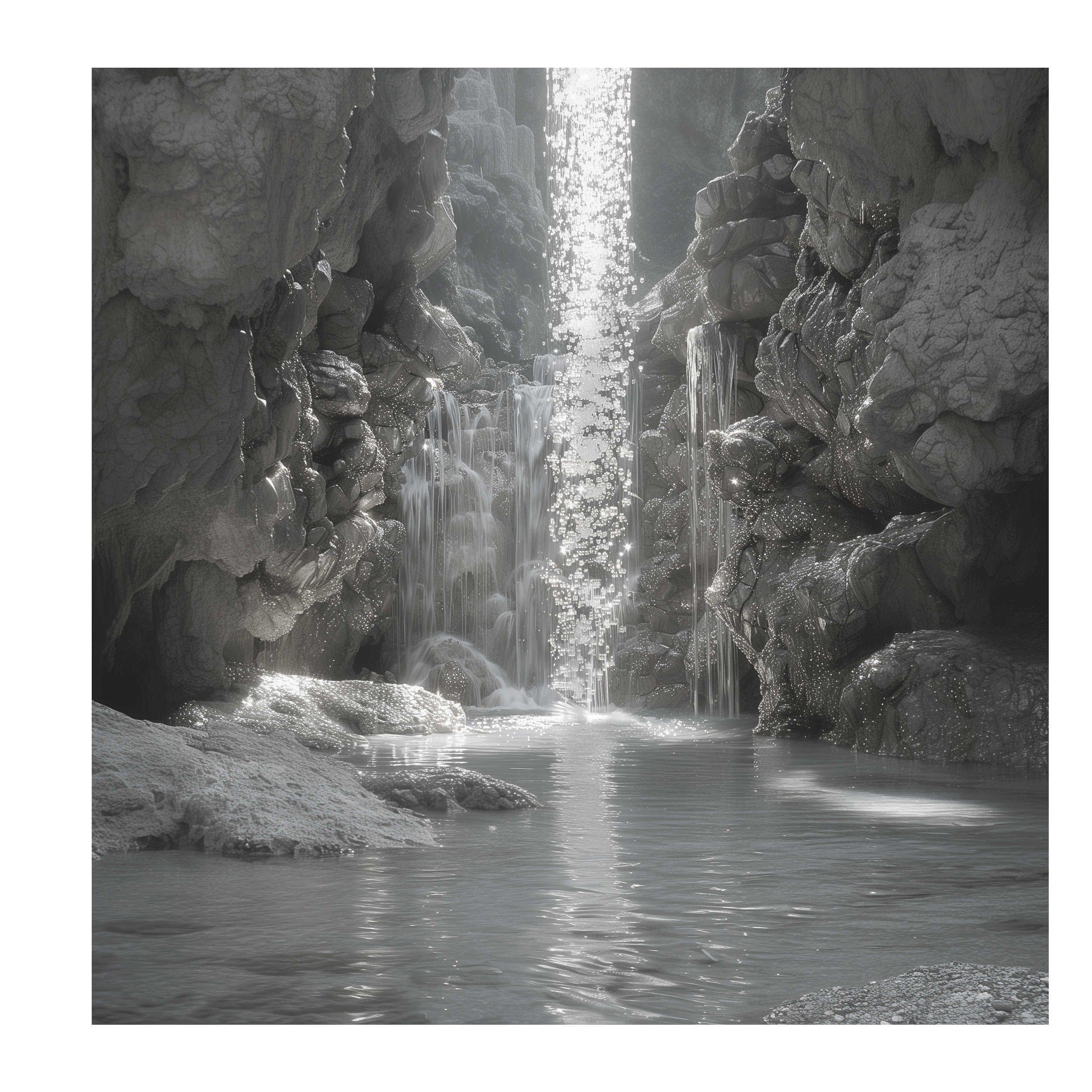 Les éléments blancs de forme irrégulière imitent l'eau en cascade tombant des falaises, tandis que les perles transparentes suspendues agissent comme des gouttelettes de l'âme, reflétant la sérénité et la purification du monde intérieur.